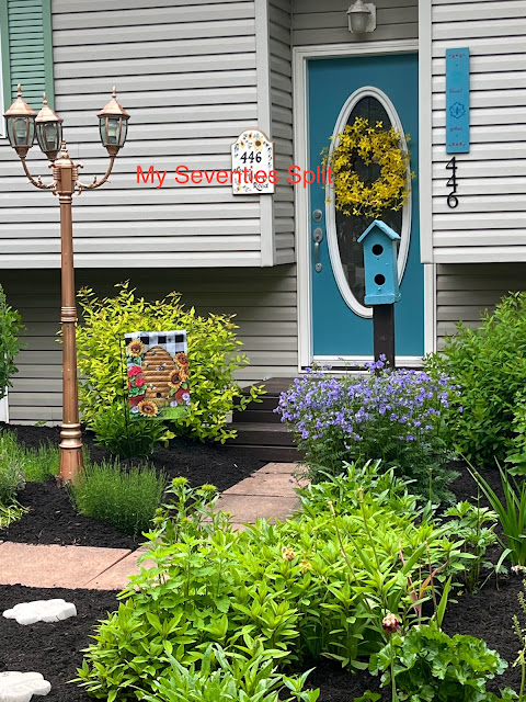 Mr. Seventies replaced a 1 x 4 board, (the starter strip for the siding)...and then filled any gaps with spray foam insulation...then the siding will be re-attached. He decided to re-home perennials planted along the walk to allow for better visual in the event another mouse attempts to chew his way through. This was the only area that had not been sealed to prevent mice and moles from getting in.